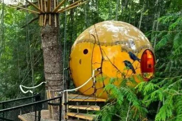 This tree house, which resembles a bird’s nest, was made in Japan. Despite its simple architecture, it is a very impressive and peaceful building. Looks great on yellow leaves. Although it is small, it can accommodate two people very comfortably.