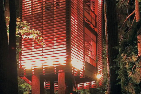 The trunk of the treehouse is built using four solid and large trees. It shines brightly at night with its different architecture.