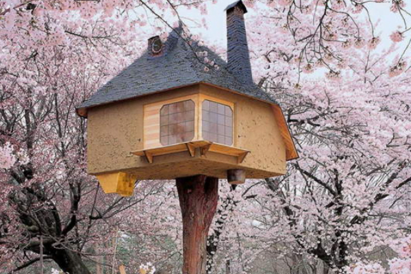 This treehouse stands out for its classic Japanese-style architecture. It looks gorgeous in the middle of the pink cherry blossoms.
