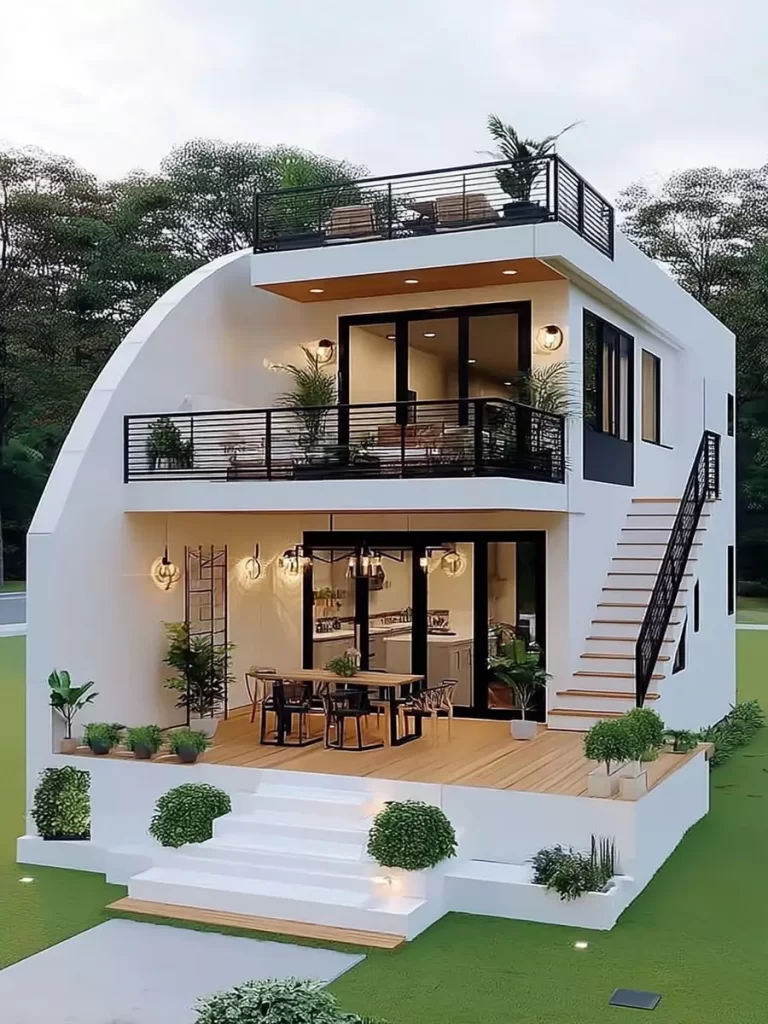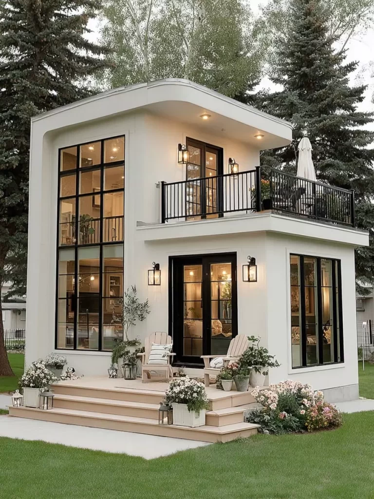 Attractive two-story white small house examples provide aesthetic and functional solutions that meet the needs of modern living. Suitable for both city life and natural surroundings, these homes are the perfect choice for those who embrace minimalist living.